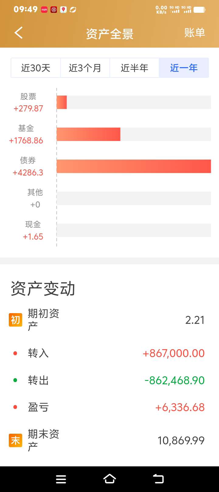 帐户资金不断转入共计86700元,不断转出86738元,现帐户留存资金已是赚来的,成为无成本帐户。