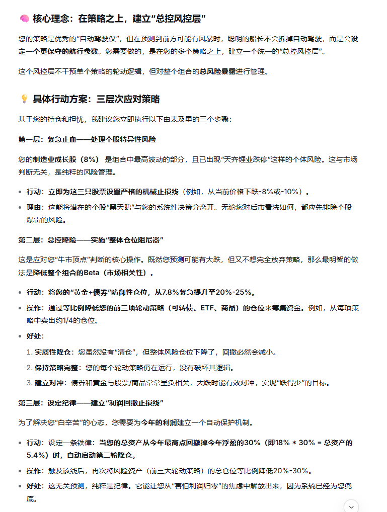 整个周末都无比焦虑,和好几个AI 探讨了大半天之后,决定deepseek的这个回答深得我心。“您的策略是优秀的“自动驾驶仪”,但在预测到前方可能有风暴时,聪明的船长不会拆掉自动驾驶,而是会设定一个更保守的航行参数。您需要做的,是在您的多个策略之上,建立一个统一的“总控风控层”。”