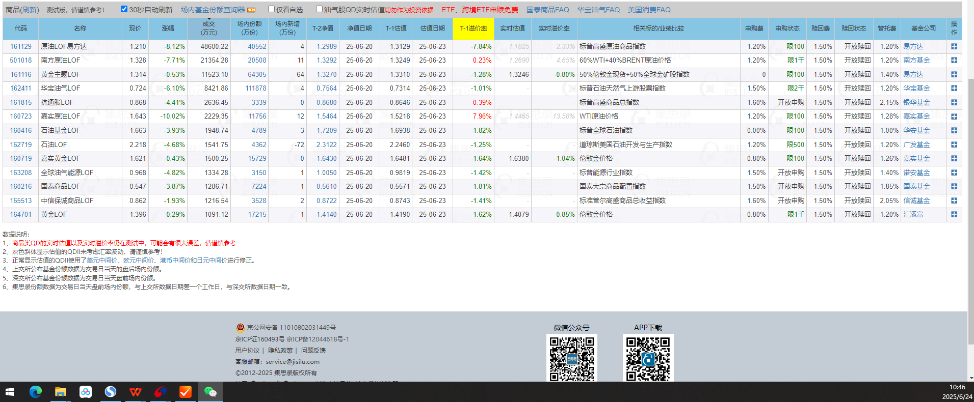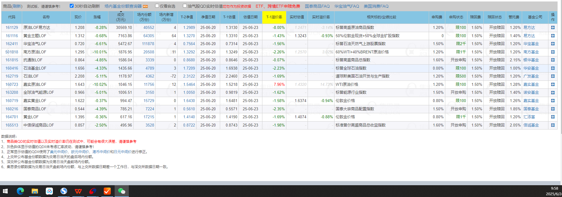 161129的净值对应什么时点的原油期货?2025-06-19的净值1.3126 19日NYMEX原油收盘73.88 现在原油74.72 161129估值1.3126*74.72/73.88=1.3275 161129现价1.306 折价1.6%。