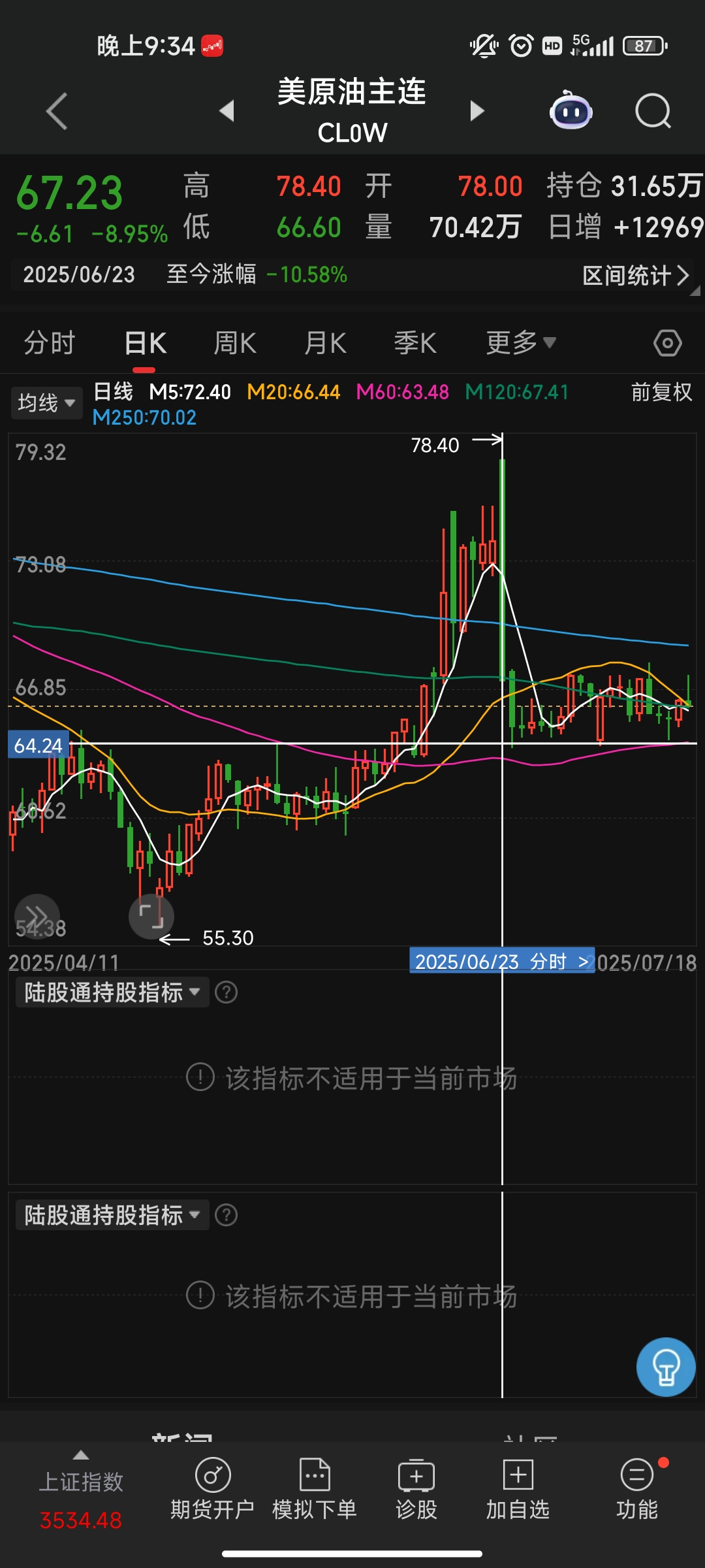 那天幕后具体发生了什么不知道,反正台前的消息是,在老美的周旋下,伊以双方发布停战信息,然后其实,从6/23那天的亚盘盘面就有点隐隐的奇怪,原油有点上涨乏力等老美时间中午后就大幅下跌了,24号亚盘开盘后,全数就已经被剁成肉泥了