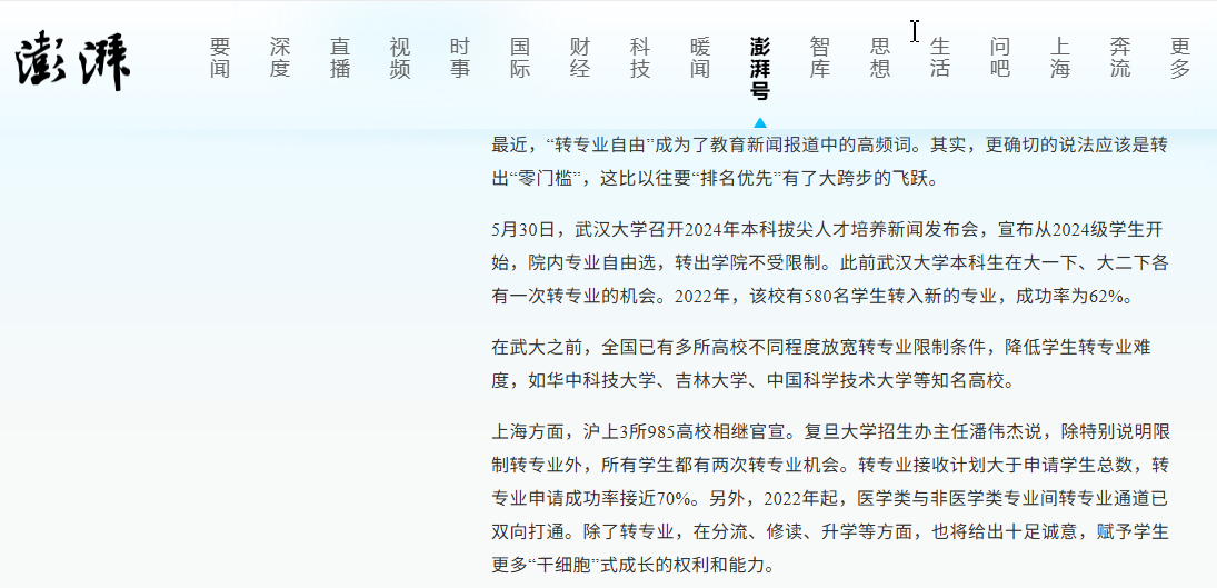 5月30日,武汉大学召开2024年本科拔尖人才培养新闻发布会,宣布从2024级学生开始,院内专业自由选,转出学院不受限制。此前武汉大学本科生在大一下、大二下各有一次转专业的机会。2022年,该校有580名学生转入新的专业,成功率为62%。