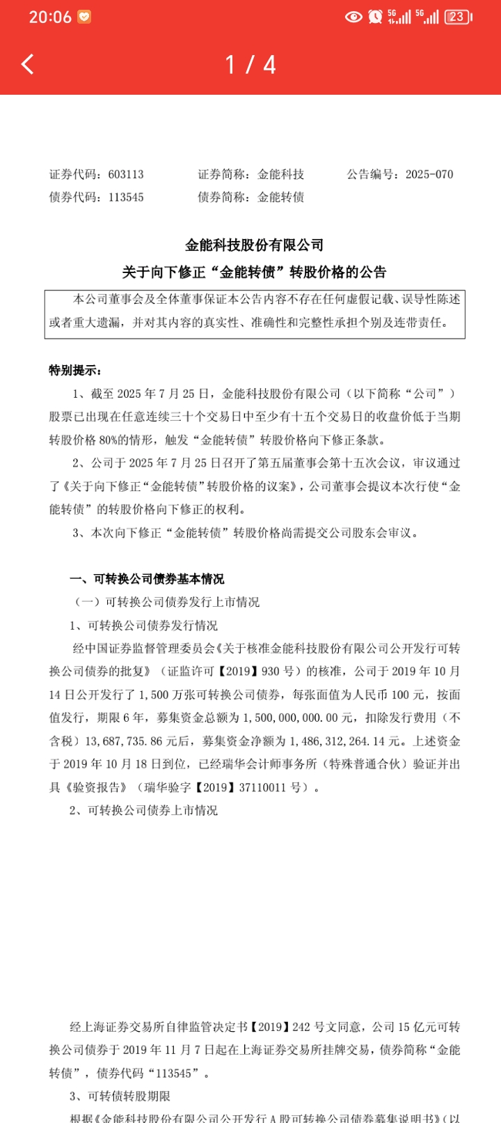 金能转债10月14日到期,赎回价110元。之前一直未下修,临到期突然提议下修,大概率下修到底能少还就少还了。我是113买入搏一搏折价转股或者强赎,最差就到期回落到110元,2个月时间也就亏不到3个点。金能科技正股7.2附近也买了点,博正股上涨,转债转股。