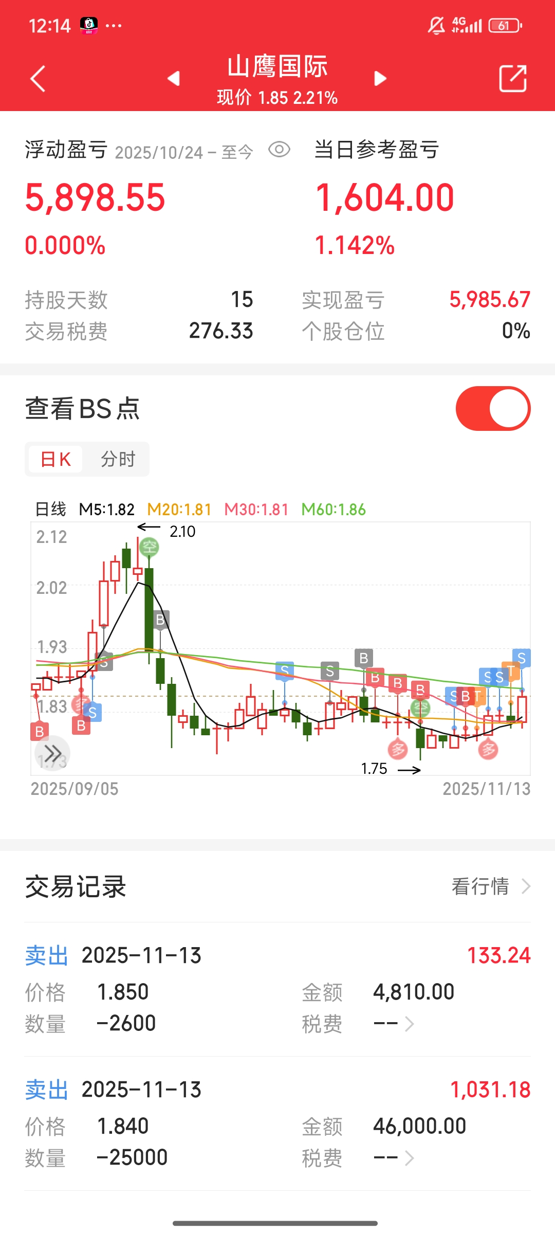 本周山鹰国际四连跌,最低1.88,可见抛压盘多大。好在周五迎来利好大涨回了口血。当前山鹰还有45%的仓位。
