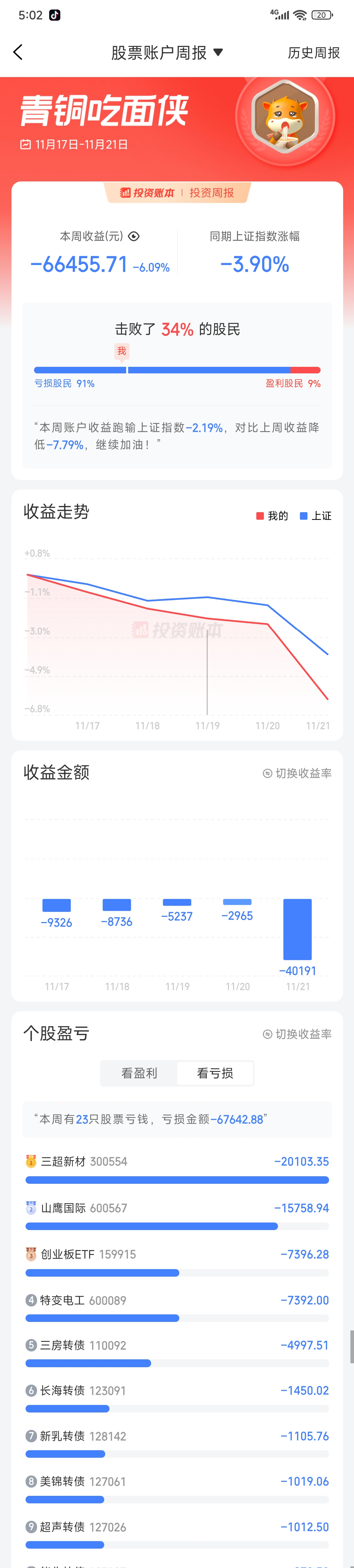 本周血亏,有些股票前期回调,想着抄底。结果遇上大跌行情亏更多。 短期还是熬着吧,等反弹后在调仓。后面估计会更加向转债靠拢。 教训:不要觉得股票便宜了有点回调就加仓。控制住股票仓位!