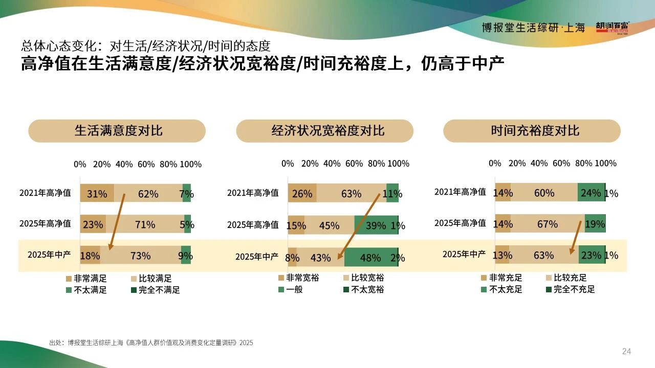 大家的生活满意度、经济状况宽裕度、时间充裕度都下滑明显