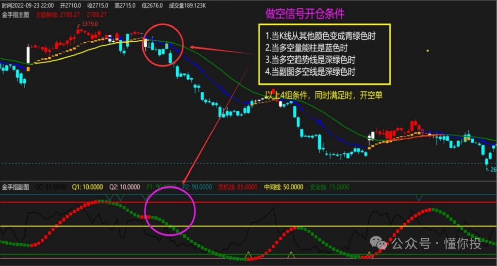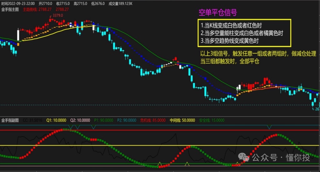 例如在做多开仓时,需要满足K线颜色、多空量能柱颜色、多空趋势线颜色以及副图多空线颜色等多个条件,这种多维度的判断可以提高信号的准确性和可靠性。