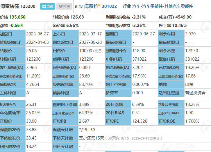 123200海泰转债的博弈思路