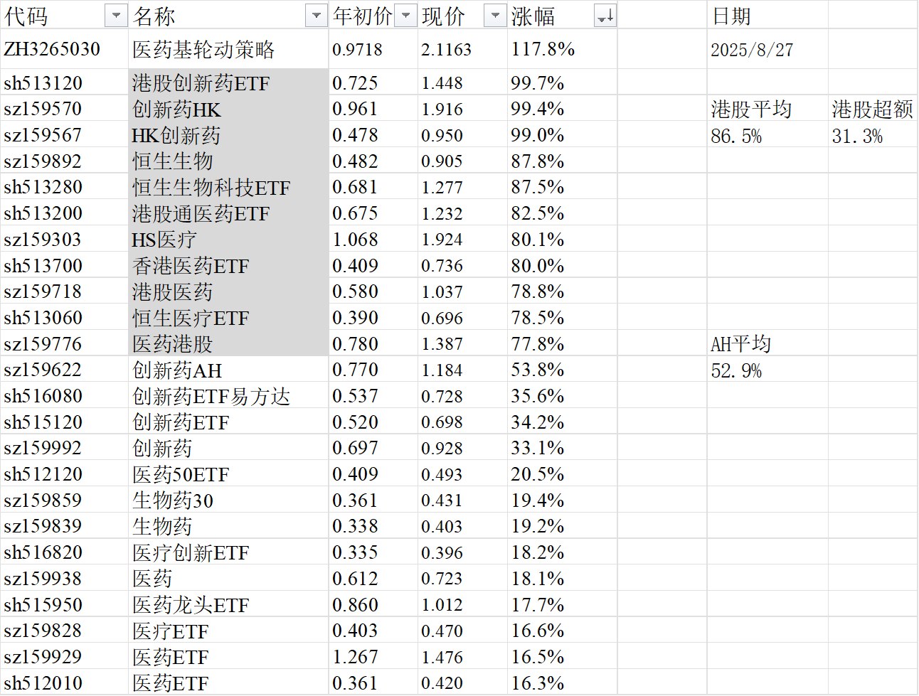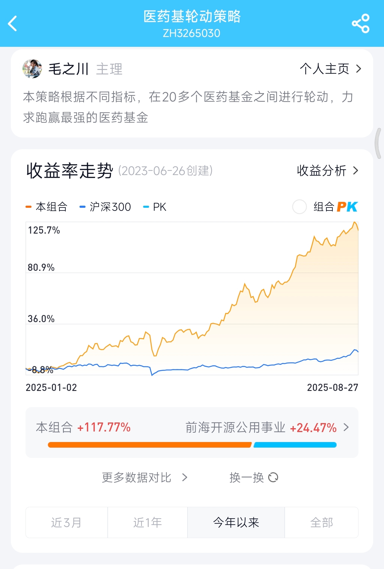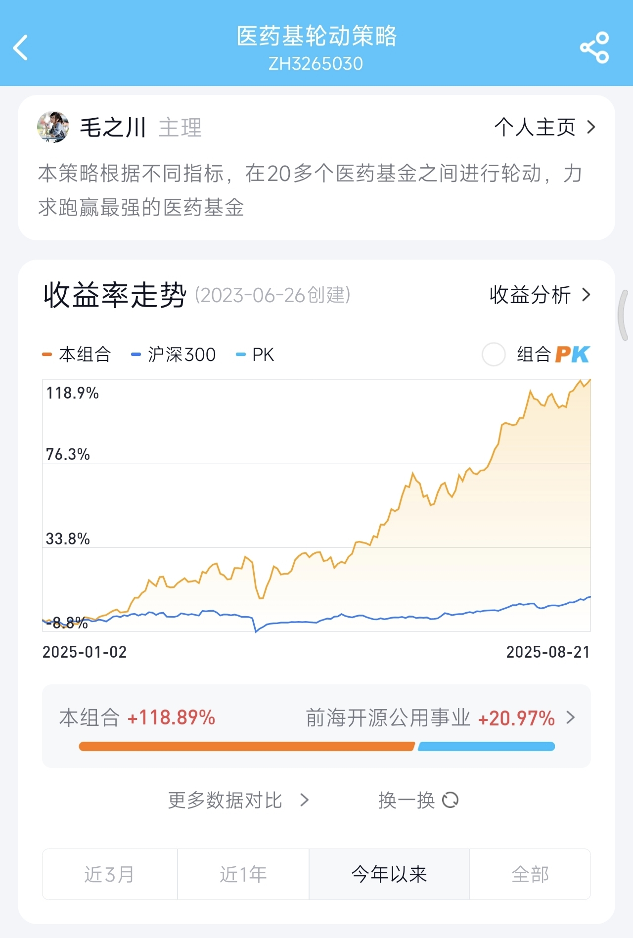 不是马后炮,已经切换A股的医药基金了,今年医药基轮动收益118.89%,不仅远超港股医药基金涨幅的平均值,更是比最强的基金都涨得多,说明轮动比较有效。