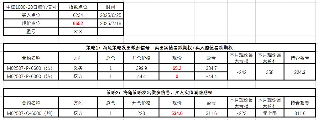 本周中证1000涨了1.41%。趋势良好。今天7月18号,就是本月的交割日。入场的期权按收盘价进行交割。本月策略1盈利324个点。策略2盈利311个点。信号还是为多,按策略继续轮换下个月的期权合约。