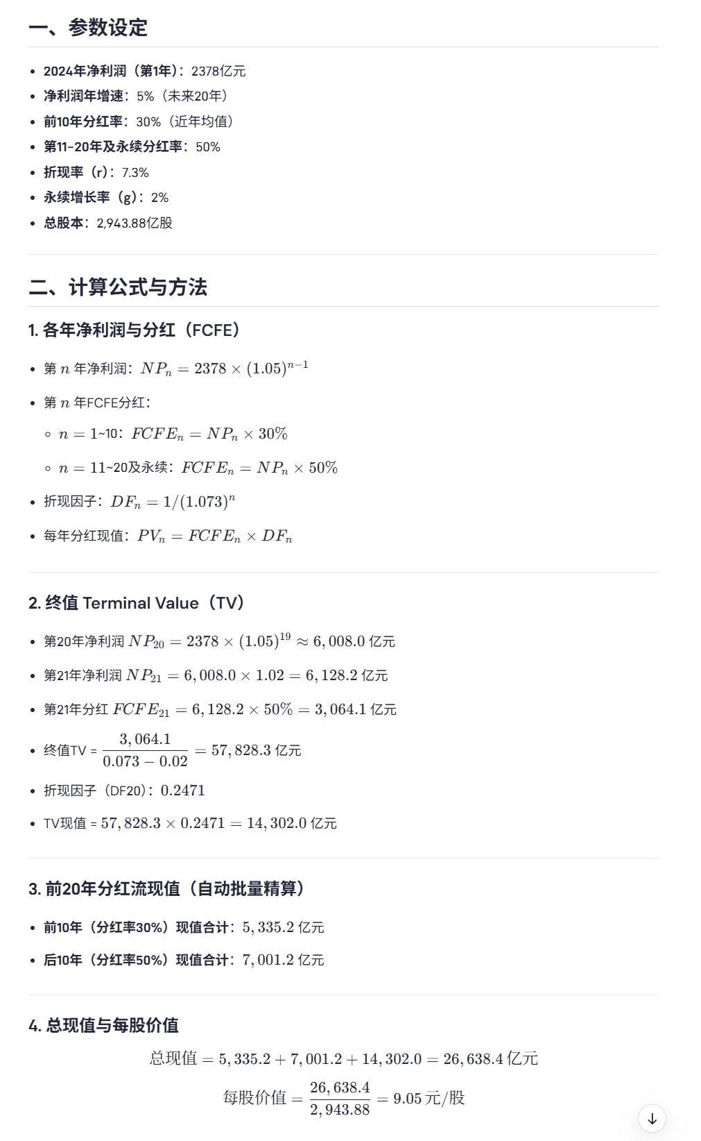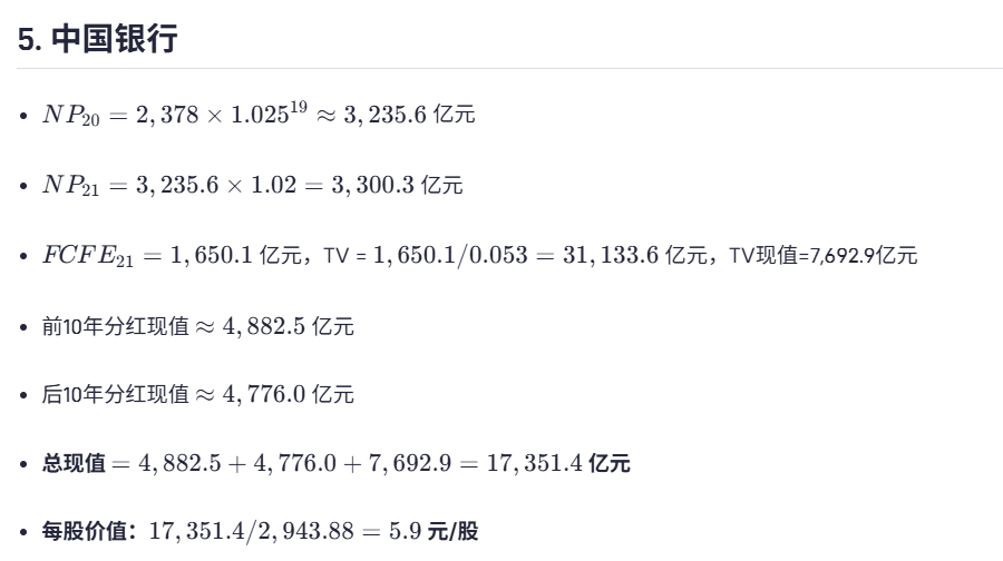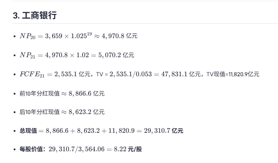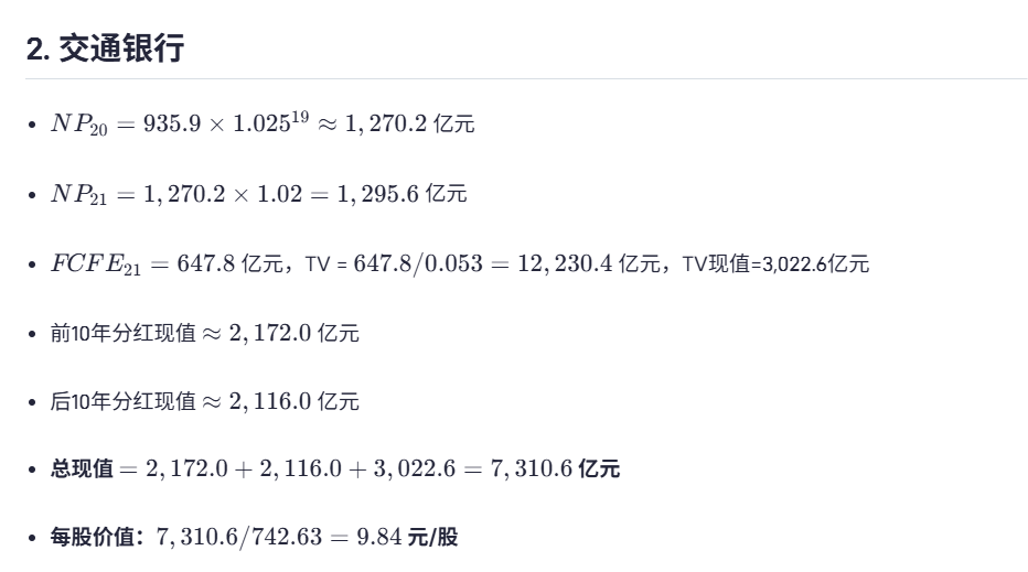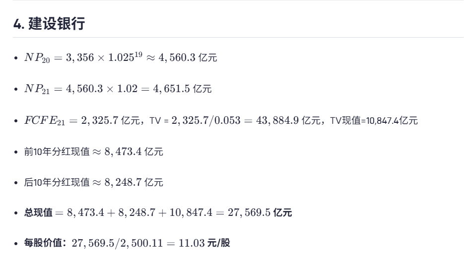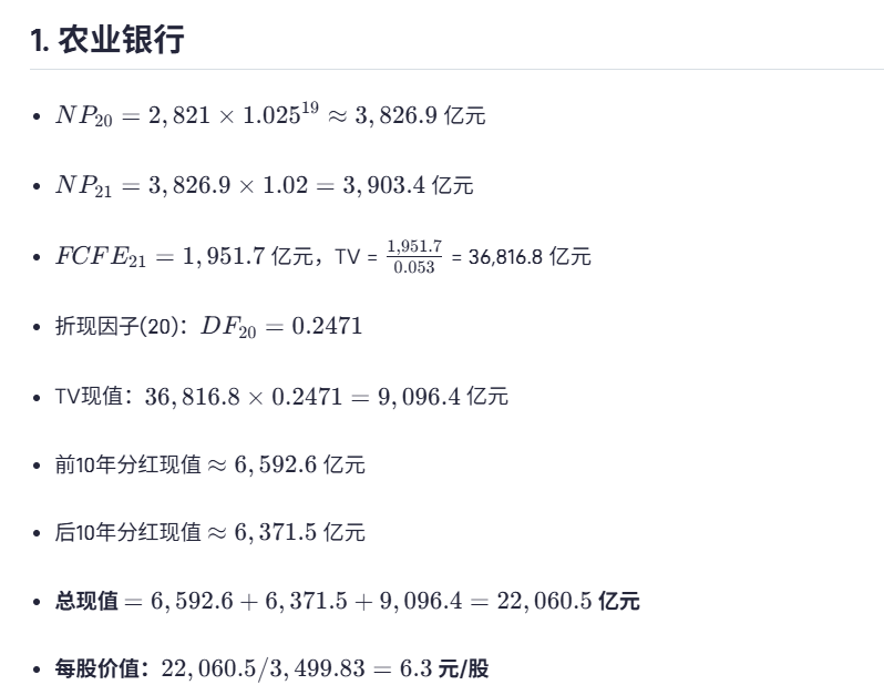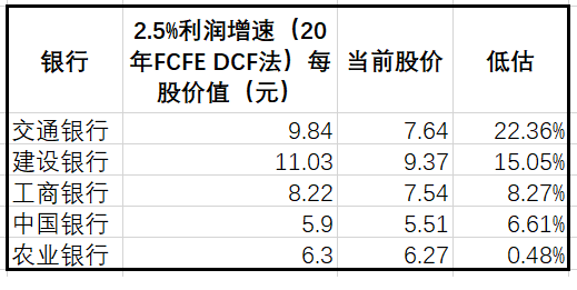 如果将未来20年的净利润增长率调整为2.5%,则各银行的估值变化如下: