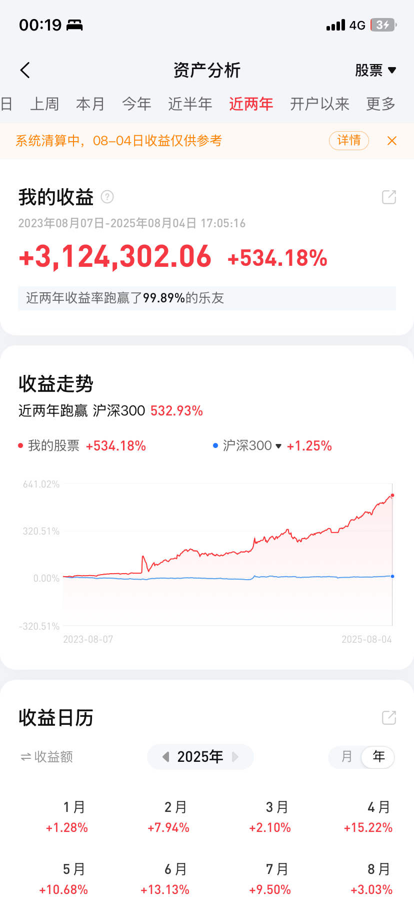 下面说回投资领域。我是14年入市的,起手就遇到了牛市,但前几年没有经验,资金也少,反复折腾,整体算是赚了个寂寞,但也算完成了市场教育。从19年起,我凑了100万家当正式起步,过程不表了,到23年10月是300万。拆迁款到位后,我资金变成了580万,总体还是受运气加持,到上周末的8月1日,资金是1400+。由于整个过程很短,两年时间可投资资产增加了1100,我没能有太直观的感受,但上周最后一笔拆迁款拿到父母和我说的时候,我才有了实现资产跃升的实感,回头看,这两年几乎是我人生中最重要的两年了。