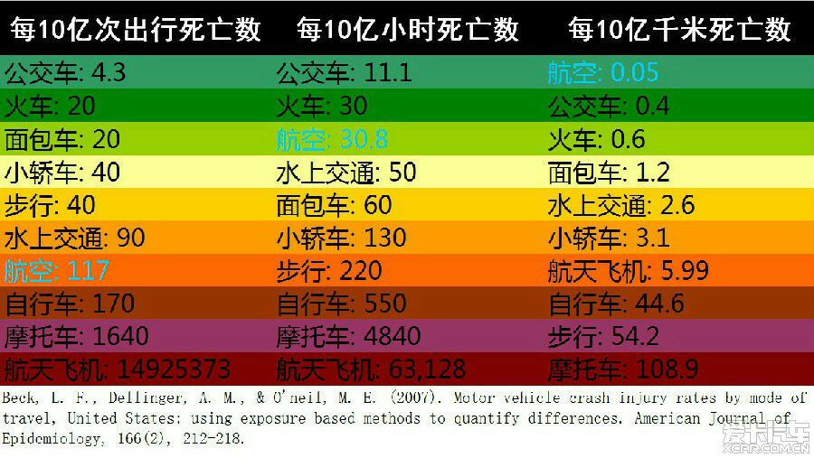 交通工具的安全系数排名是,铁路、公交大巴、飞机、自驾小车。网上传言飞机是最安全的交通工具的说法,其实只是算法不同,按每百万里程飞机是最安全,但按每百万乘客数、每百万出行次数,飞机的事故率都很高。统计数据中最不安全的是小车,我自己的体验也是如此,回想自己20多年开车经历,鬼门关都兜过好几次了,所以现在很少开车,尽量打车。