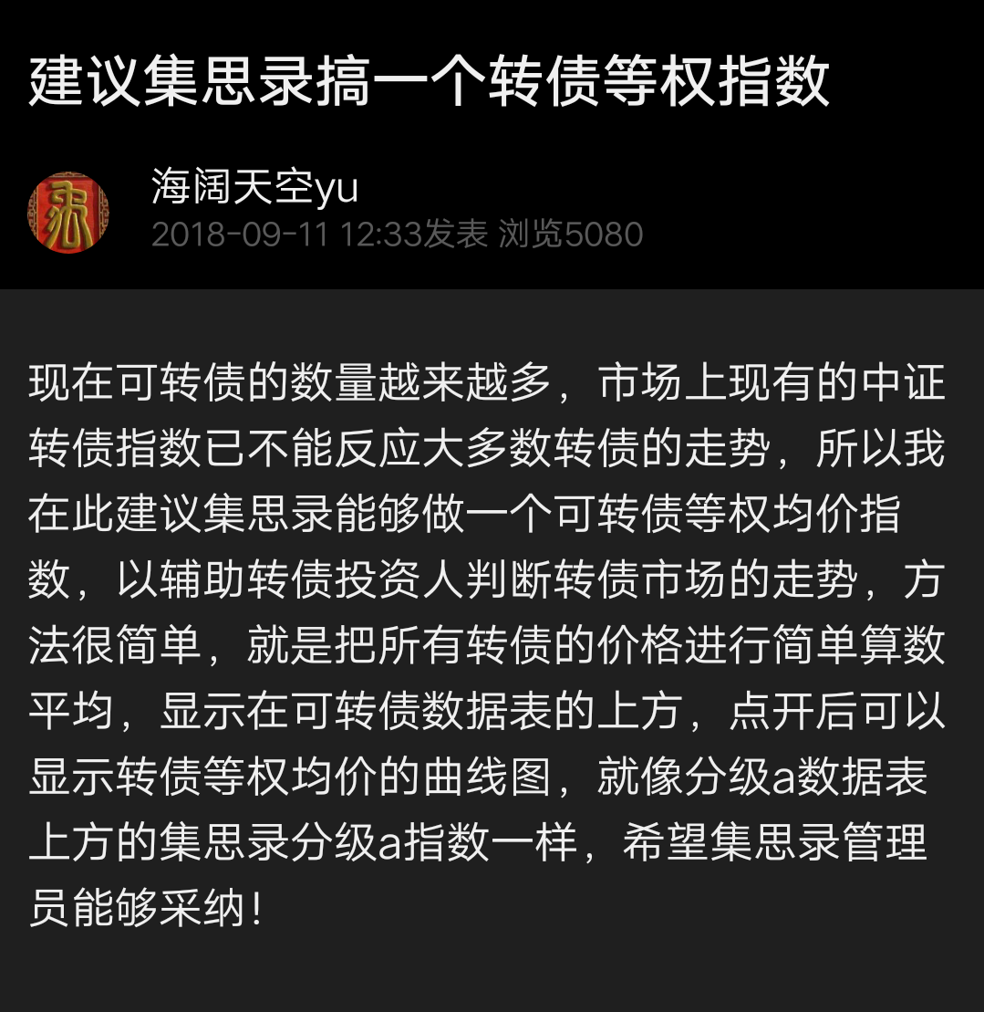 2018年下半年我曾在集思录发了一个帖子,建议集思录搞一个转债等权指数,现在我再次建议集思录发行一个可转债等权指数基金,或者与基金公司合作发行一个可转债等权指数ETF,我想 一定会受到很多转债投资人的支持的。