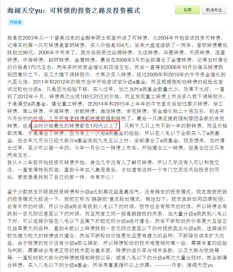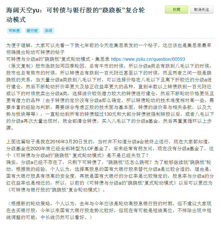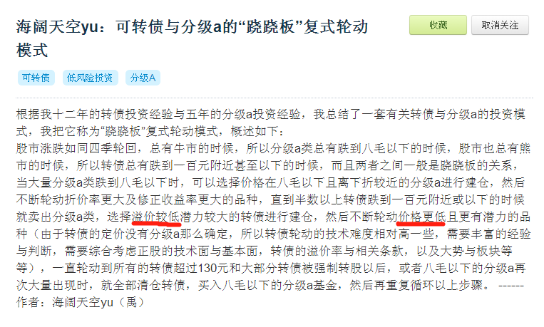 下面截图是上面帖子提到的《可转债与分级a的跷跷板复合投资模式》,写于2016年3月,应该是集思录最早提出可转债轮动的帖子,里面也明确指出了轮动可转债的主要指标是“低价格”与“低溢价”。