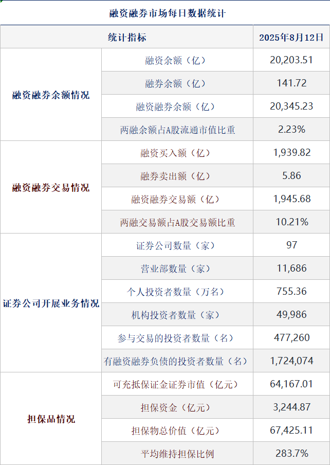 2025年8月12日融资余额20,203.51亿元,两融余额占A股流通市值比重2.23%;融资融券交易额1,945.68亿元,两融交易额占A股交易额比重10.21%。