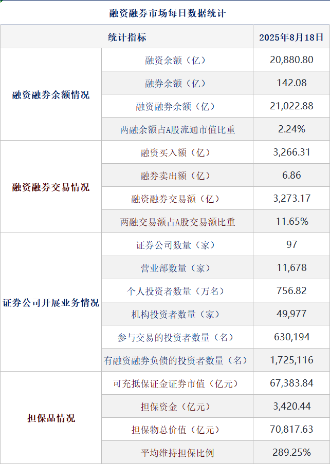 2025年8月18日融资余额20,880.80亿元,两融余额占A股流通市值比重2.24%;融资融券交易额3,273.17亿元,两融交易额占A股交易额比重11.65%。