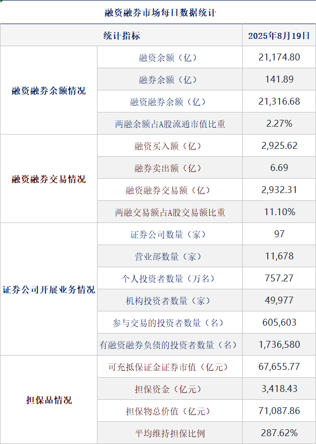 2025年8月19日融资余额21,174.80亿元,两融余额占A股流通市值比重2.27%;融资融券交易额2,932.31亿元,两融交易额占A股交易额比重11.10%。