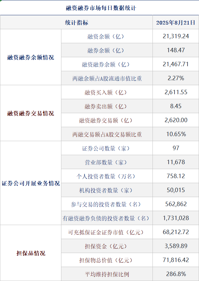 2025年8月21日融资余额21,319.24亿元,两融余额占A股流通市值比重2.27%;融资融券交易额2,620.00亿元,两融交易额占A股交易额比重10.65%。
