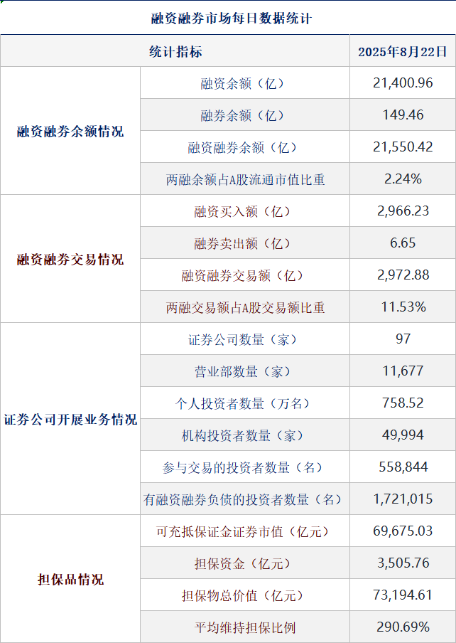 2025年8月22日融资余额21,400.96亿元,两融余额占A股流通市值比重2.24%;融资融券交易额2,972.88亿元,两融交易额占A股交易额比重11.53%。