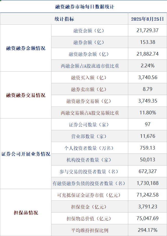 2025年8月25日融资余额21,729.37亿元,两融余额占A股流通市值比重2.24%;融资融券交易额3,749.35亿元,两融交易额占A股交易额比重11.80%。