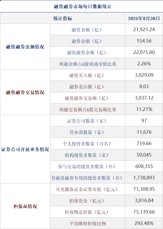 2025年8月26日融资余额21,921.24亿元,两融余额占A股流通市值比重2.26%;融资融券交易额3,037.12亿元,两融交易额占A股交易额比重11.21%。