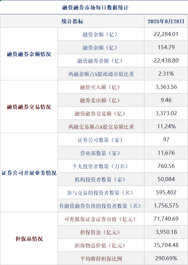 2025年8月28日融资余额22,284.01亿元,两融余额占A股流通市值比重2.31%;融资融券交易额3,373.02亿元,两融交易额占A股交易额比重11.24%。