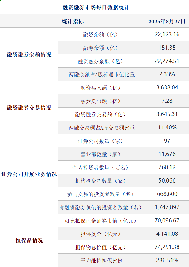 2025年8月27日融资余额22,123.16亿元,两融余额占A股流通市值比重2.33%;融资融券交易额3,645.31亿元,两融交易额占A股交易额比重11.40%。