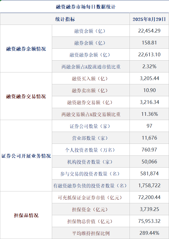 2025年8月29日融资余额22,454.29亿元,两融余额占A股流通市值比重2.32%;融资融券交易额3,216.34亿元,两融交易额占A股交易额比重11.36%。