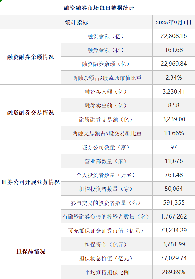 2025年9月1日融资余额22,808.16亿元,两融余额占A股流通市值比重2.34%;融资融券交易额3,239.00亿元,两融交易额占A股交易额比重11.66%。
