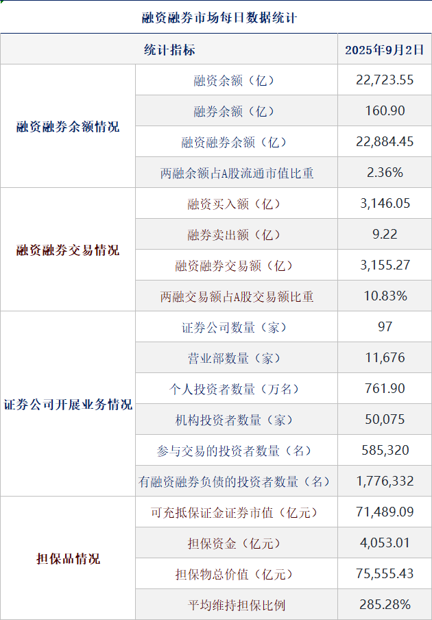 2025年9月2日融资余额22,723.55亿元,两融余额占A股流通市值比重2.36%;融资融券交易额3,155.27亿元,两融交易额占A股交易额比重10.83%。