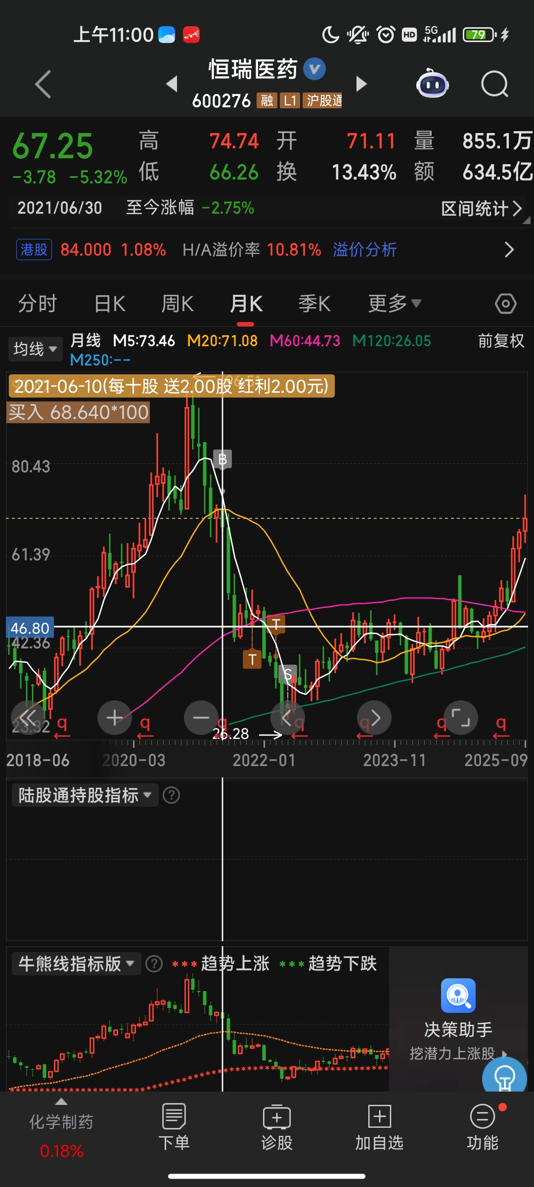 目前白酒(泸州老窖)赚15%,医药(恒瑞医药)赚20%,地产(万科A)在成本附近。