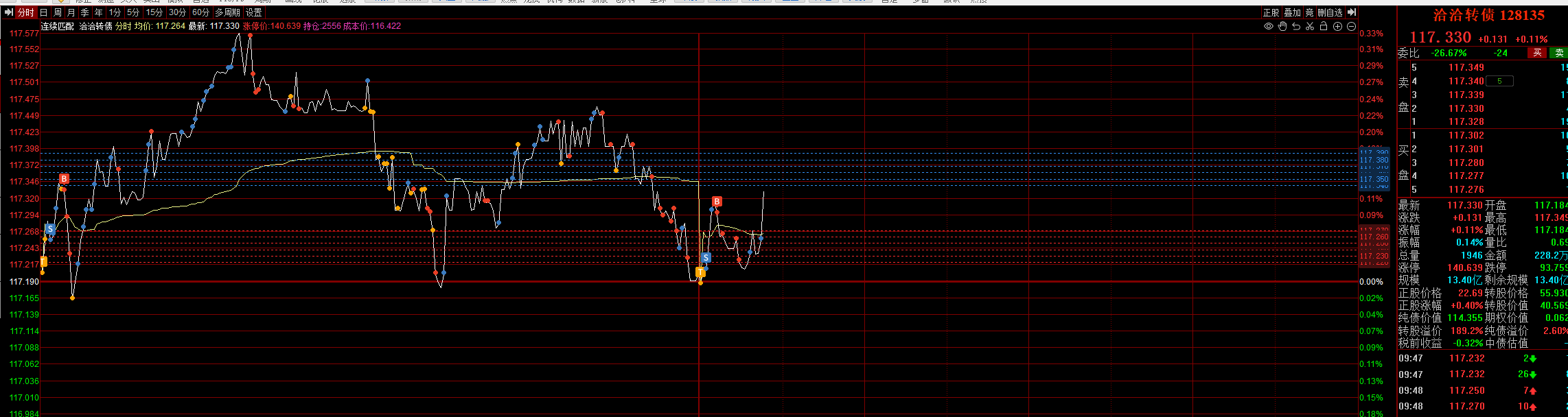 至于风险收益比,我个人认为看什么标的。就拿洽洽转债来说,深度债性到期保底116.8元,最多亏几毛钱,十天就T回来了。正股资产负债率不高,高风险不存在的。明年初之前都不会下调转股价,也不可能涨太多,上下空间都卡死这几个月肯定就是箱体震荡走势,这种标的最适合做T,当然,如果到11月或者12月份还是目前价位,则考虑持有不动博弈下修了。