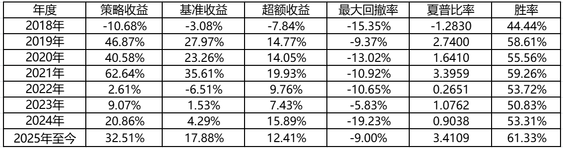 可承受度高。最大回撤区间 15%(2018、2024),其余年份≤13%。夏普比率整体领先,胜率维持 50-60%。