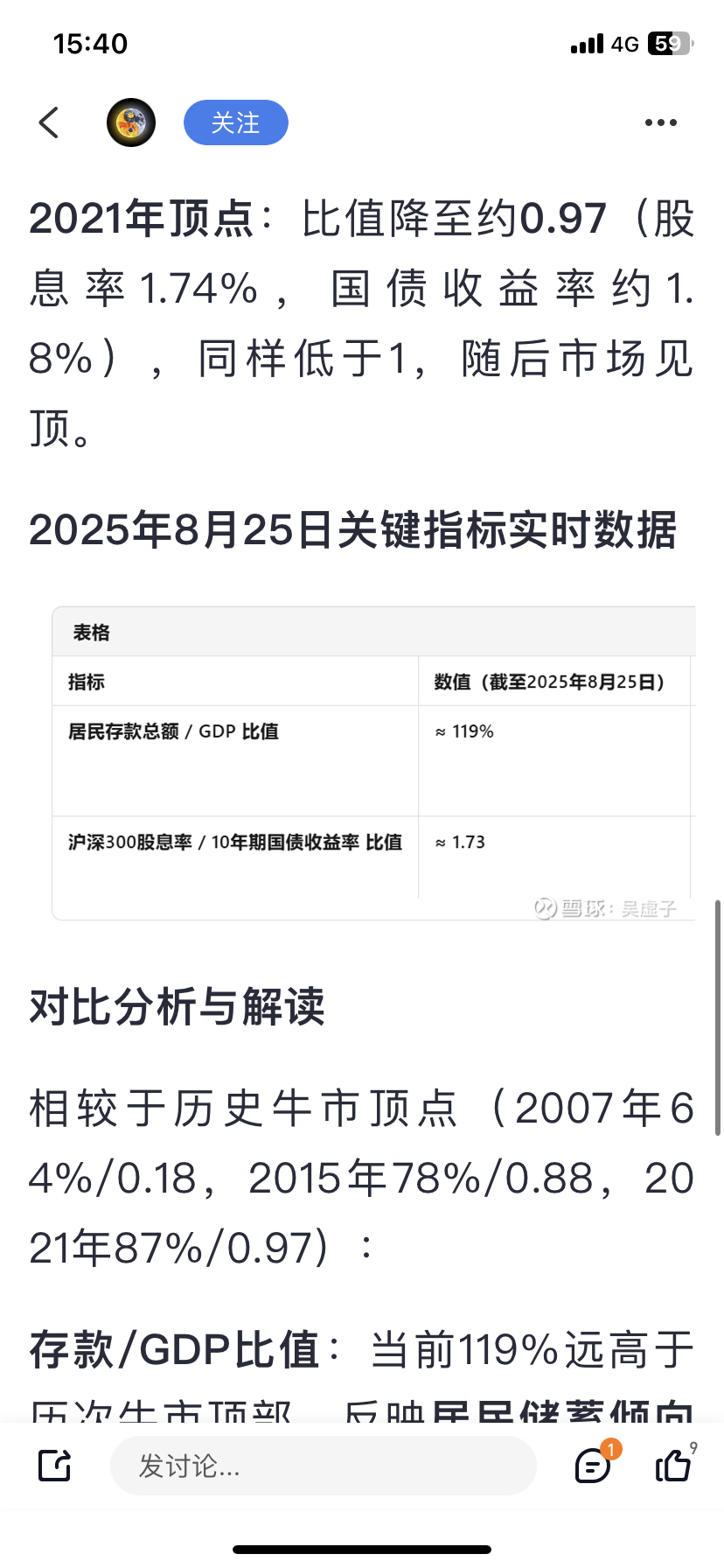 1)A股总市值103万亿,港股中大陆公司和中概股30几万亿。GDP135-140万亿,其中GNP估计占80%。我觉得看这些数字要谨慎一点了。關於第二点,我觉得人性永远不变。现在没有大规模入市恰恰说明现在远未到顶。很多去年924行情后才进来的韭菜才刚刚解套。到顶前一定是绝大部分人都是盈利丰富的。所以一点风吹草动就会引起鸟兽散。我有 不少亲戚最近解套了,正在问我能不能加仓。