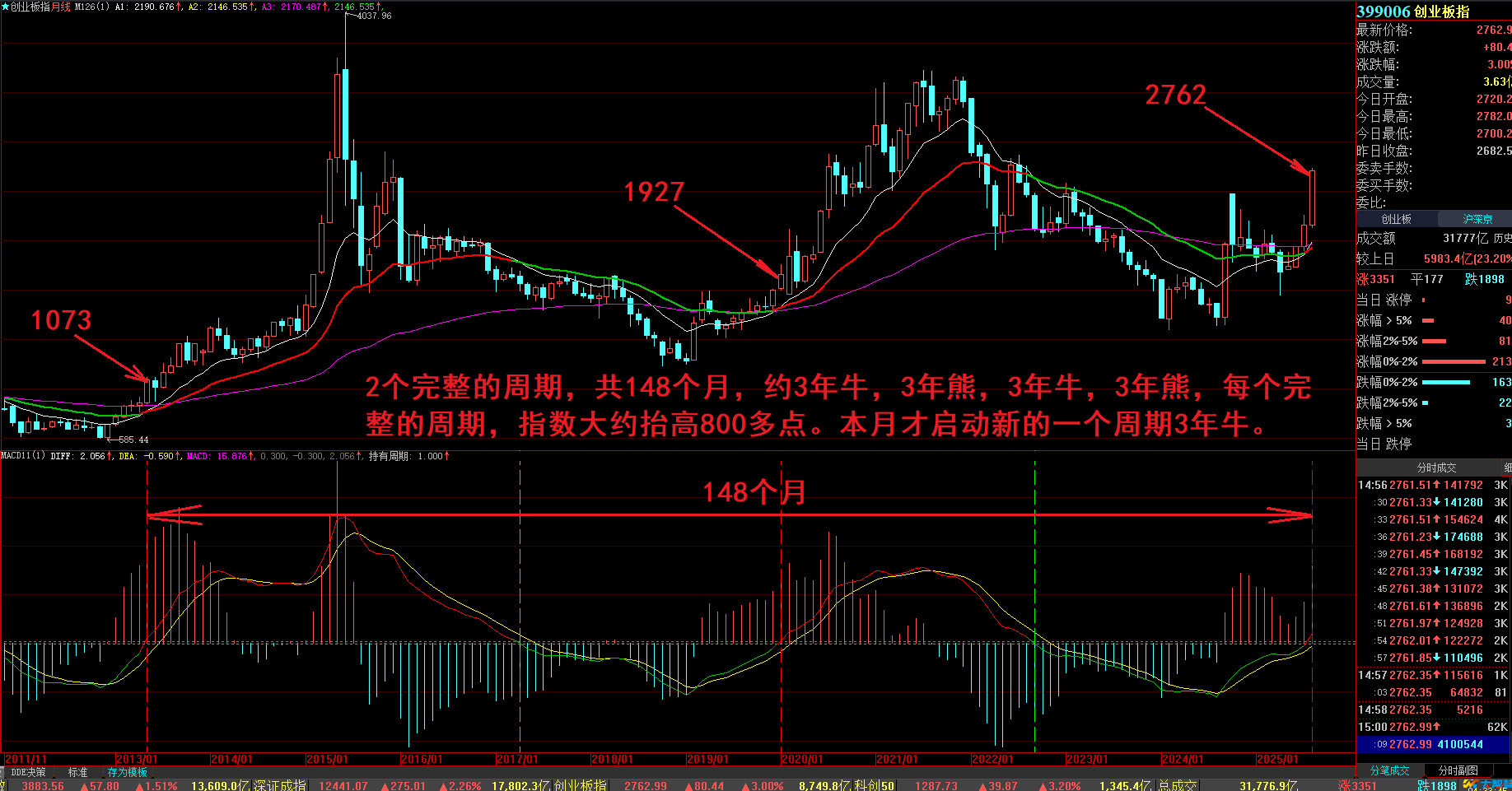 但凡对股市的周期规律有所了解,都不会在当下害怕股市见顶。你这个图,13-15年牛三年,16-18年熊三年,19-21年牛三年,22-24年熊三年,25年是牛三年的起始第一年。感觉是不是24年是起始年的话也可以,那还能牛到明年底啦。