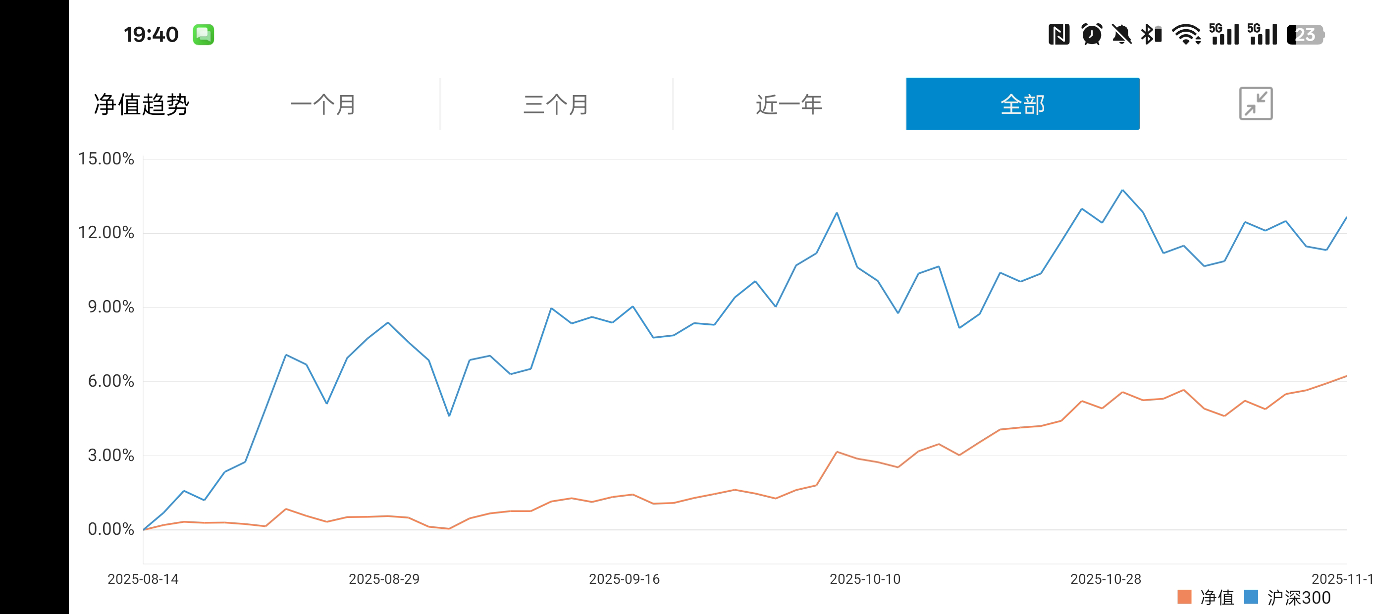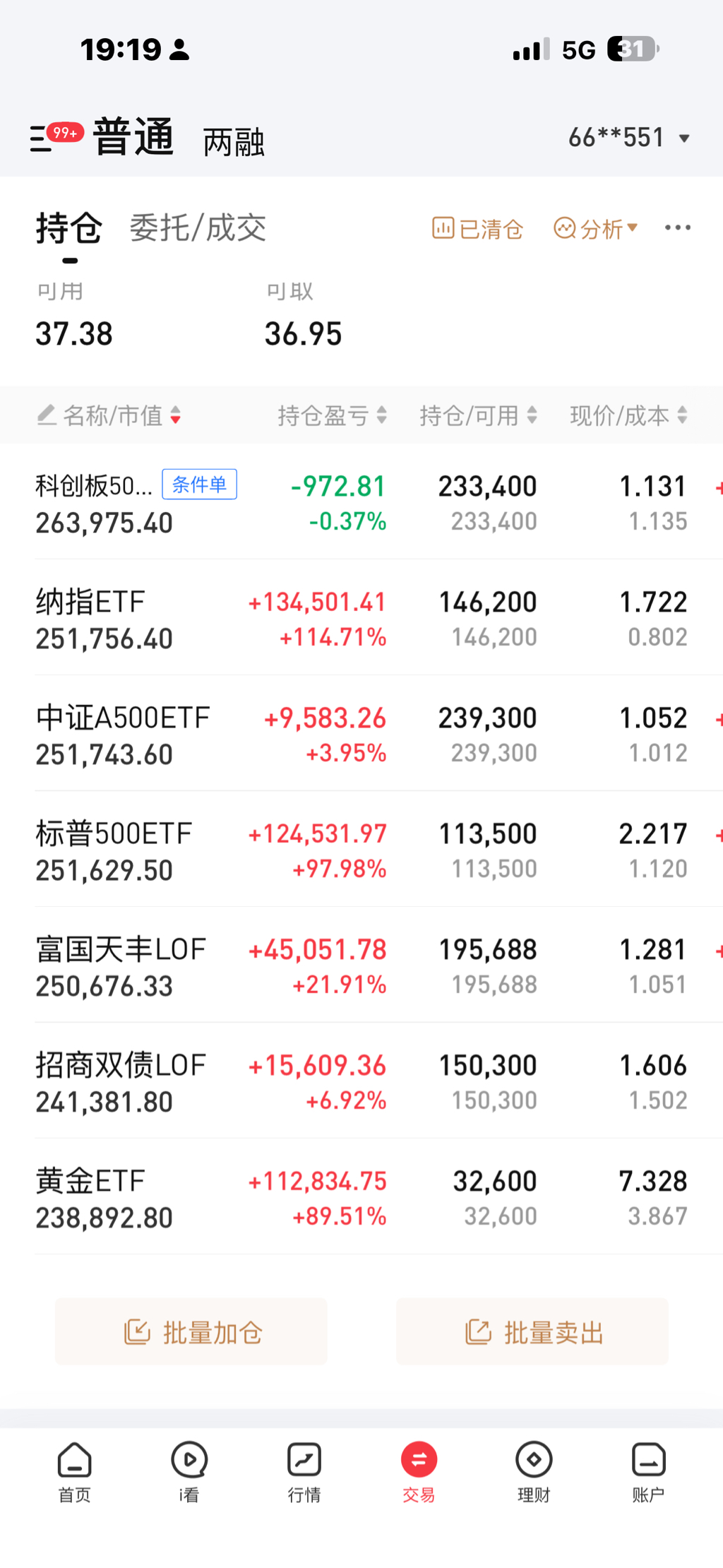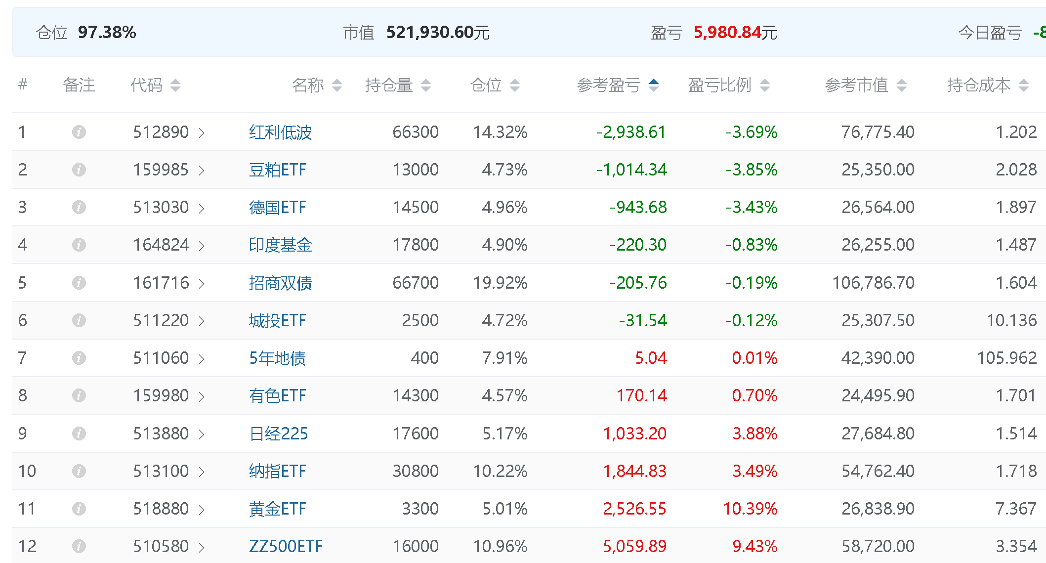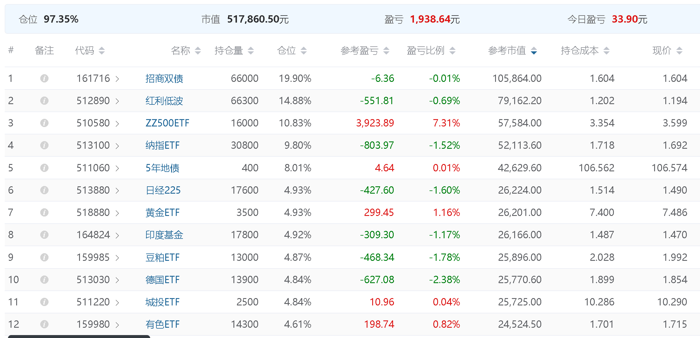 持仓净值:1.0037总仓位:97.35%累计盈亏:1,938.64元下个月继续加油!持仓比例比较均衡,下个月可能会卖出部分500etf,其他的稍微补点。还是要看交易成本,资金量小了很尴尬。这个是什么记录软件