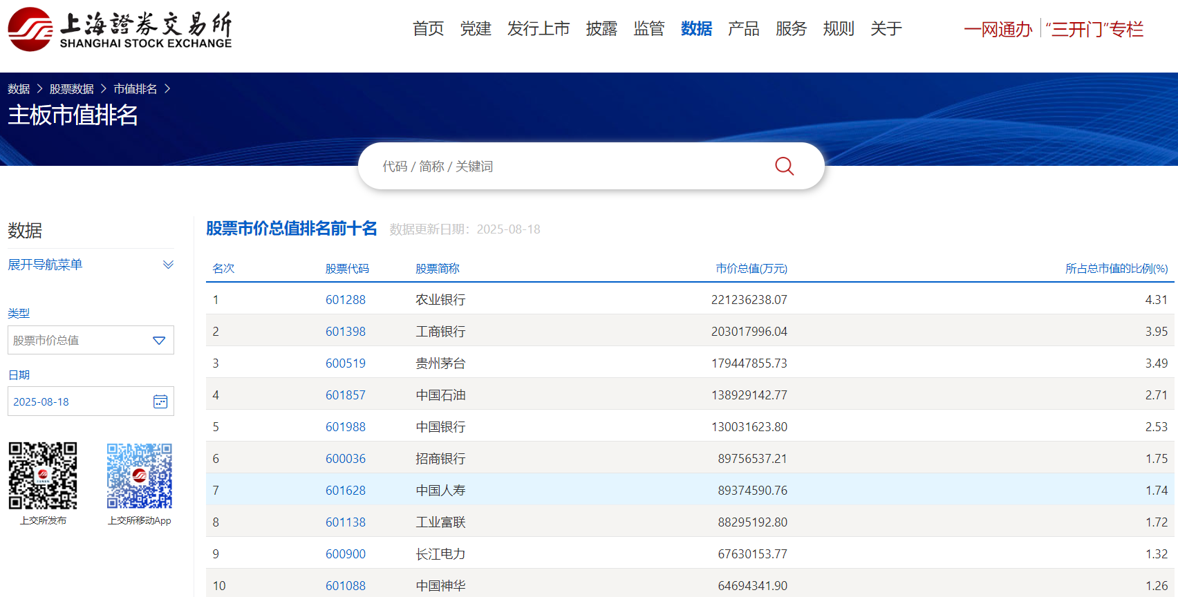 2025年8月18日,上交所股票总市值598,481.89亿元,股票数量2324只。