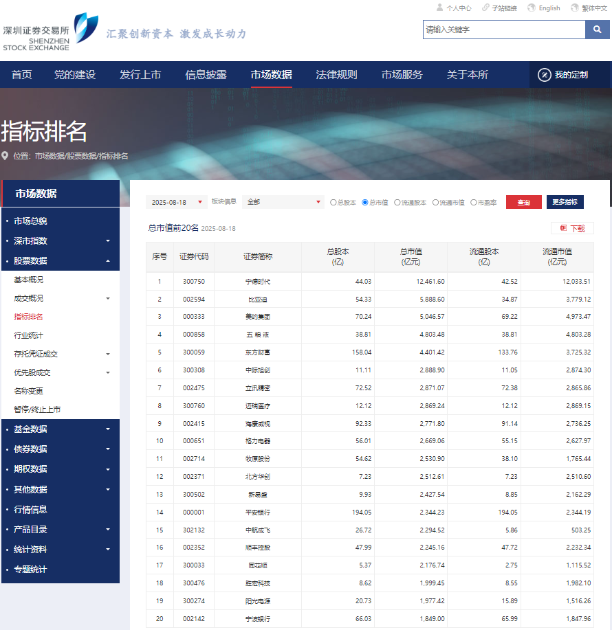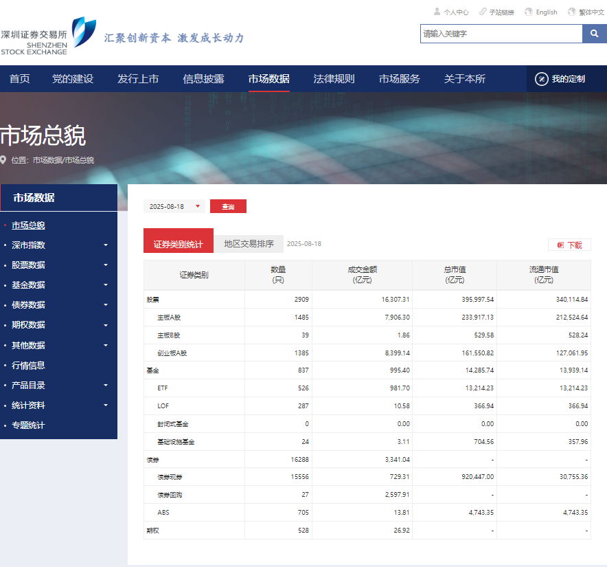 2025年8月18日,深交所股票总市值395,997.54亿元,股票数量2909 只。