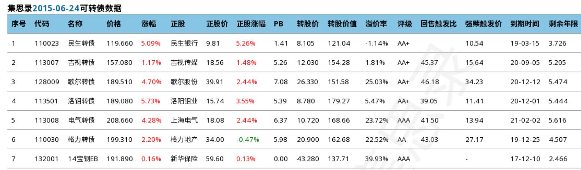 可以看一下图中5支2015年牛市当年新上市可转债。2015年6月24日,吉视转债157.08元,次月7日公告强赎,最后交易日收盘价100.18元,半个月下跌36%。洛钼转债从189元,到次月9日以130.55元的价格强赎退市,半个月下跌30%。2015年6月24日,189元的歌尔转债,208元的电气转债,199元的格力转债,到2016年2月1日分别跌至128元,117元,123元。仅8个月,跌幅达到30~40%。