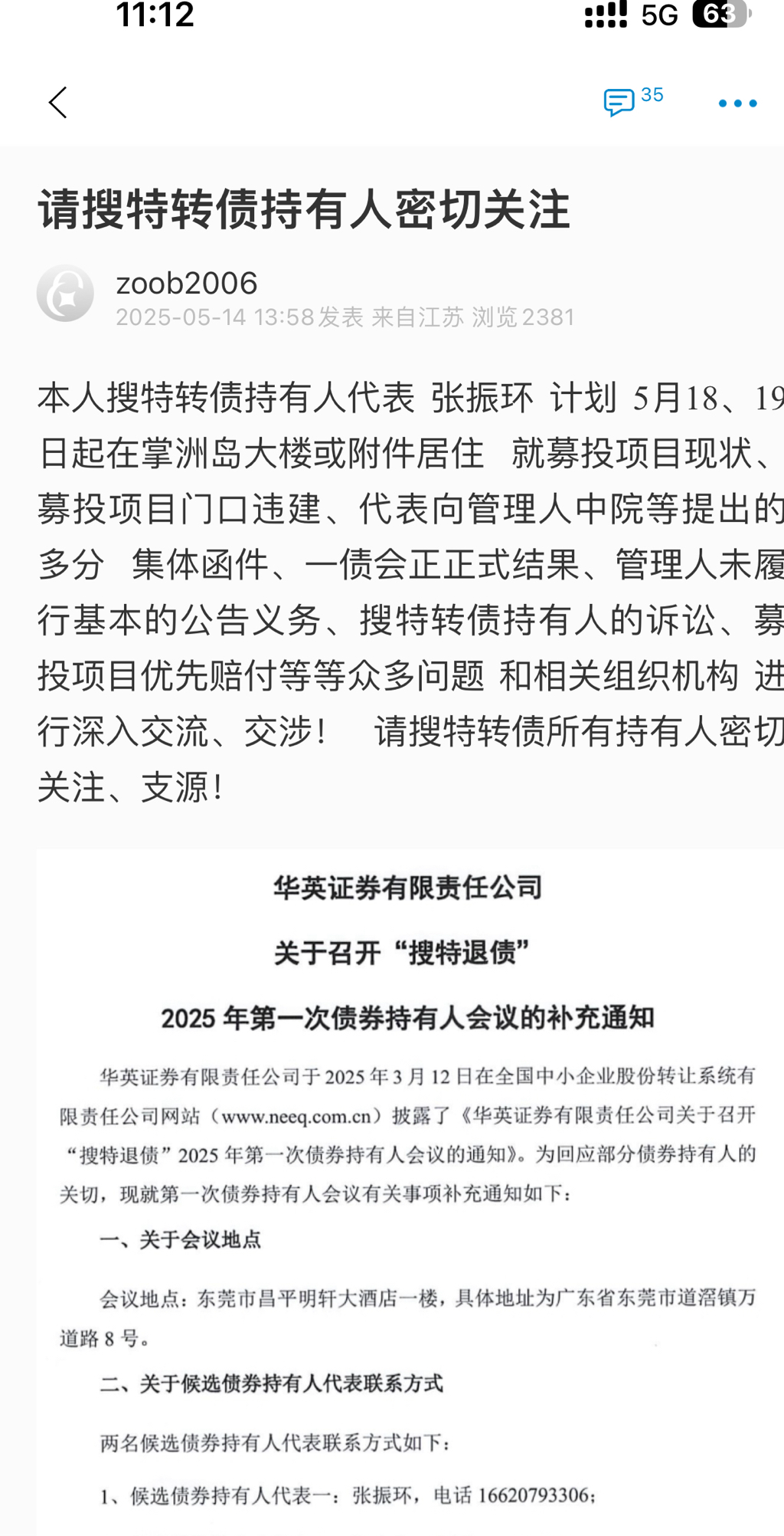 为什么要同意张振环、阳小飞代表持有人?这二位仁兄是什么人?持有多少特搜转债?有哪些专业背景?就像西方议员竞选一样,他们是不是应该出个声明或者承诺:始终以转债持有人的利益为先,在法律允许的范围内最大限度的追究发行人的违约责任云云?前面帖子有介绍,我们二人都是在搜特转债募投项目大楼,搭帐篷居住十日以上,宣示主权的! 争取募投项目优先赔付搜特转债持有人是他们自己 去年以来就团结起来的合理持仓超过搜特转债总余额10%的持有人共同意愿! 我们人数近200人,包括前二十大持有人中一多半,均授权给代表了