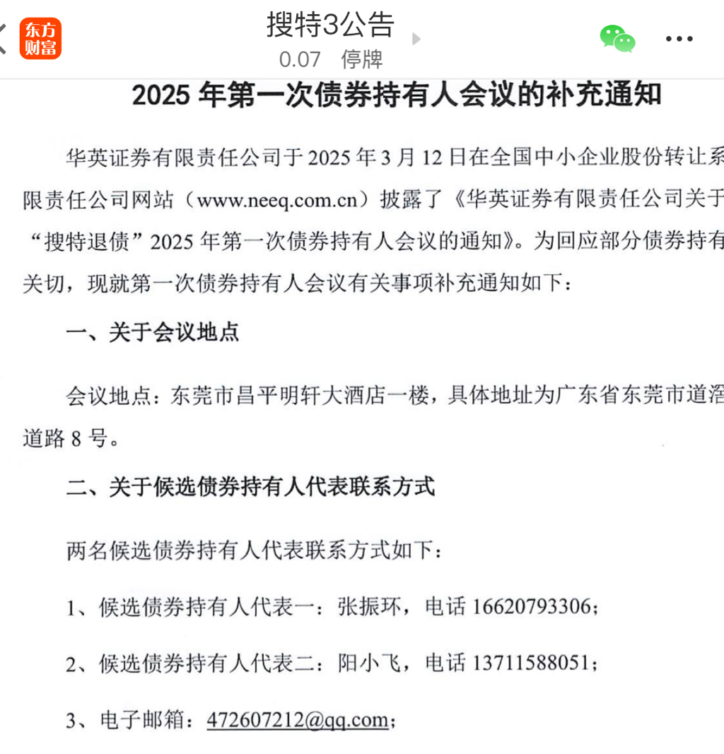 发行人第一次破产债权人会议时,管理人曾对搜特退债持有人反复短信提醒、引导参会,然而可转债持有人代表却无法主动与持有人联络。