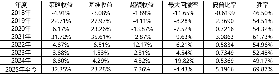 2025年至今:策略收益为32.35%,基准收益为23.28%,超额收益为7.36%,最大回撤率为-4.43%,夏普比率为5.1966,胜率为69.87%。