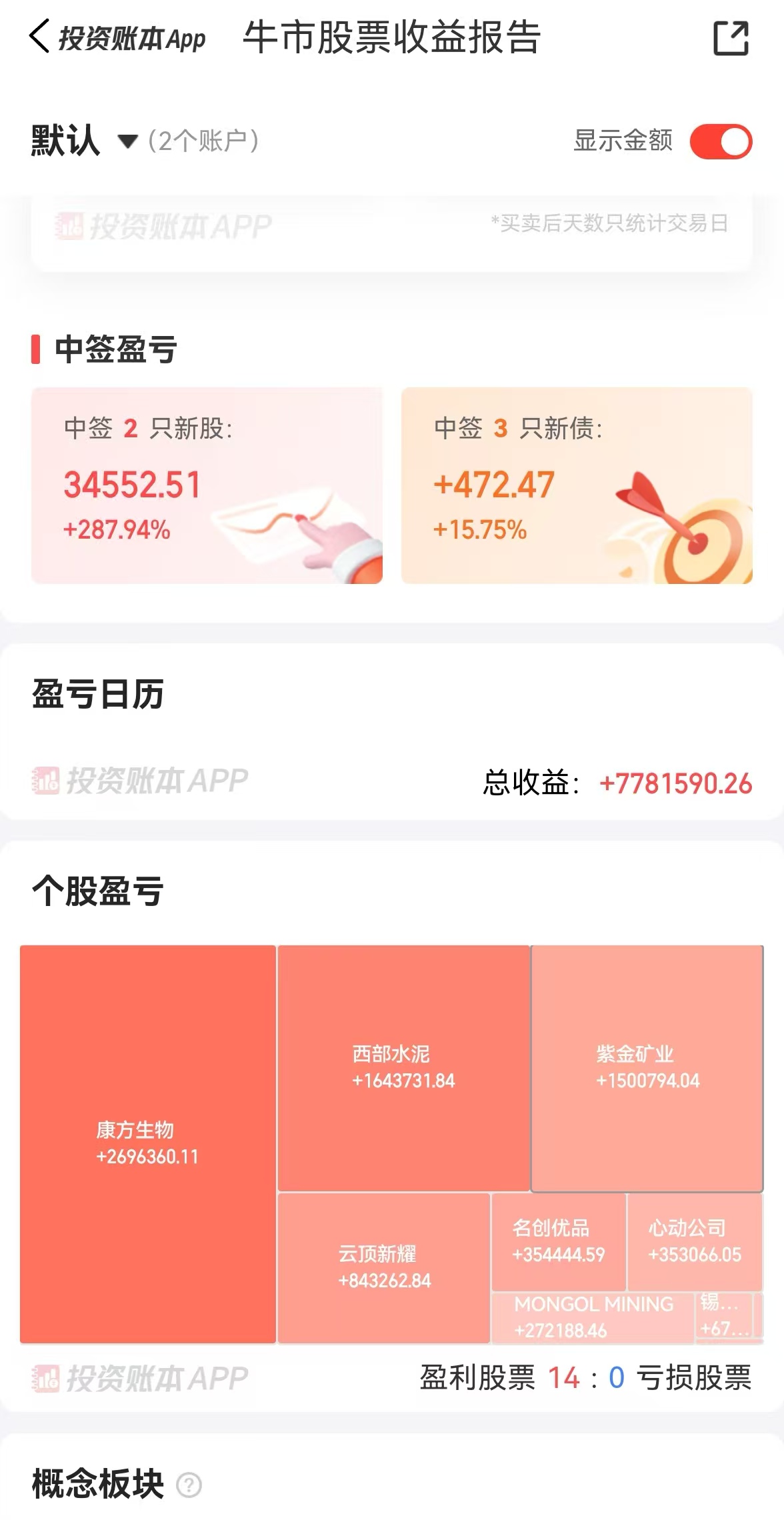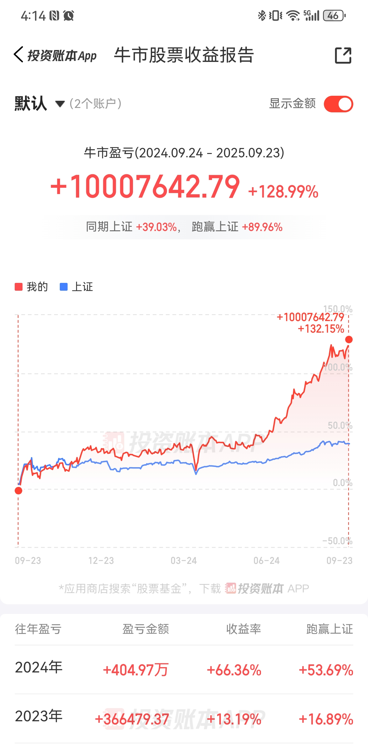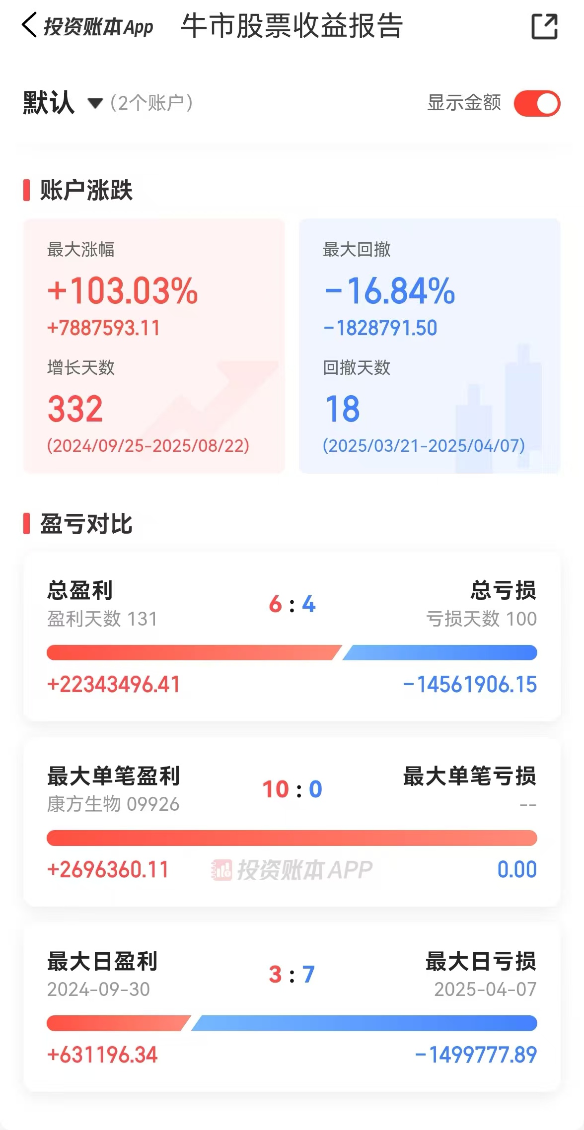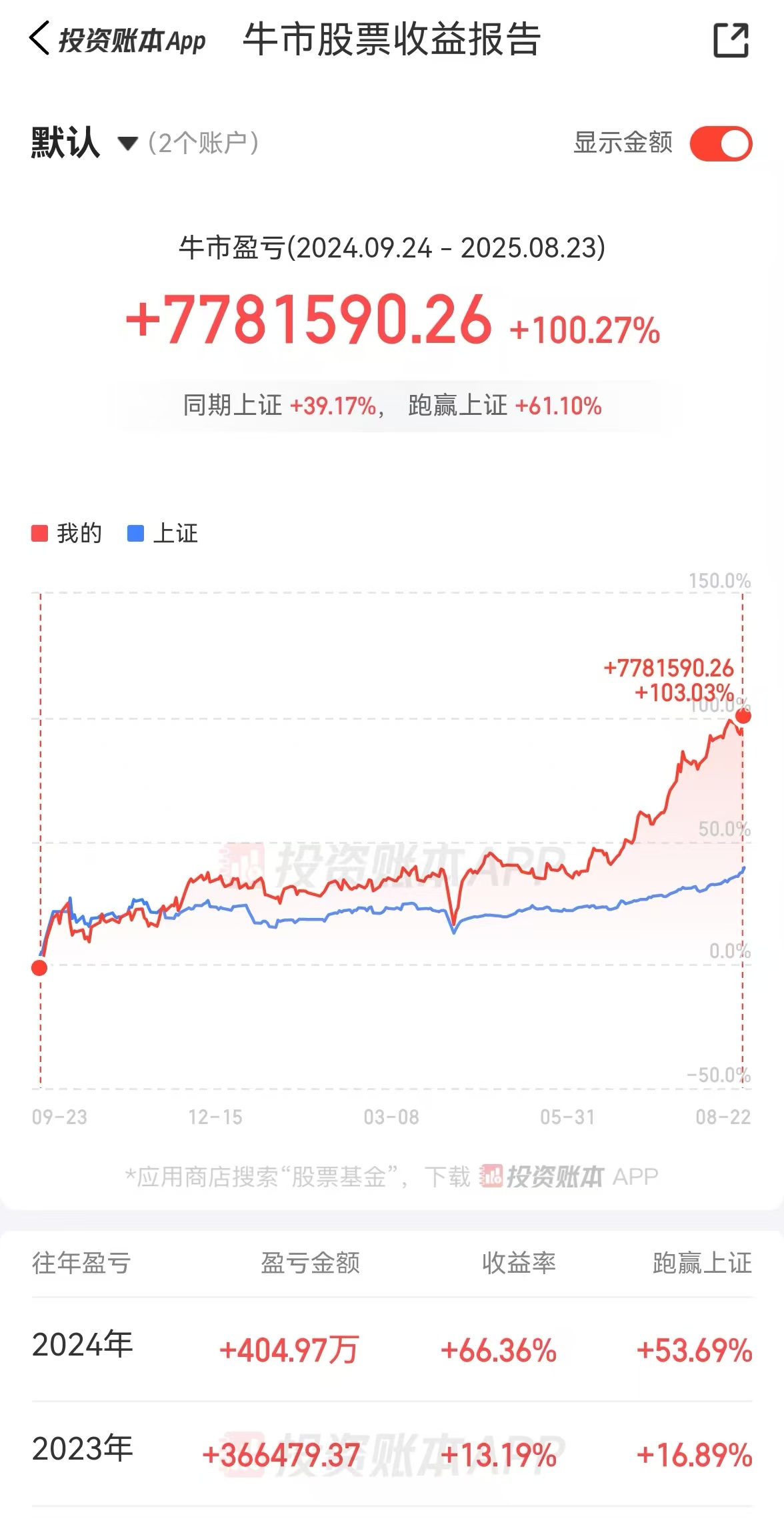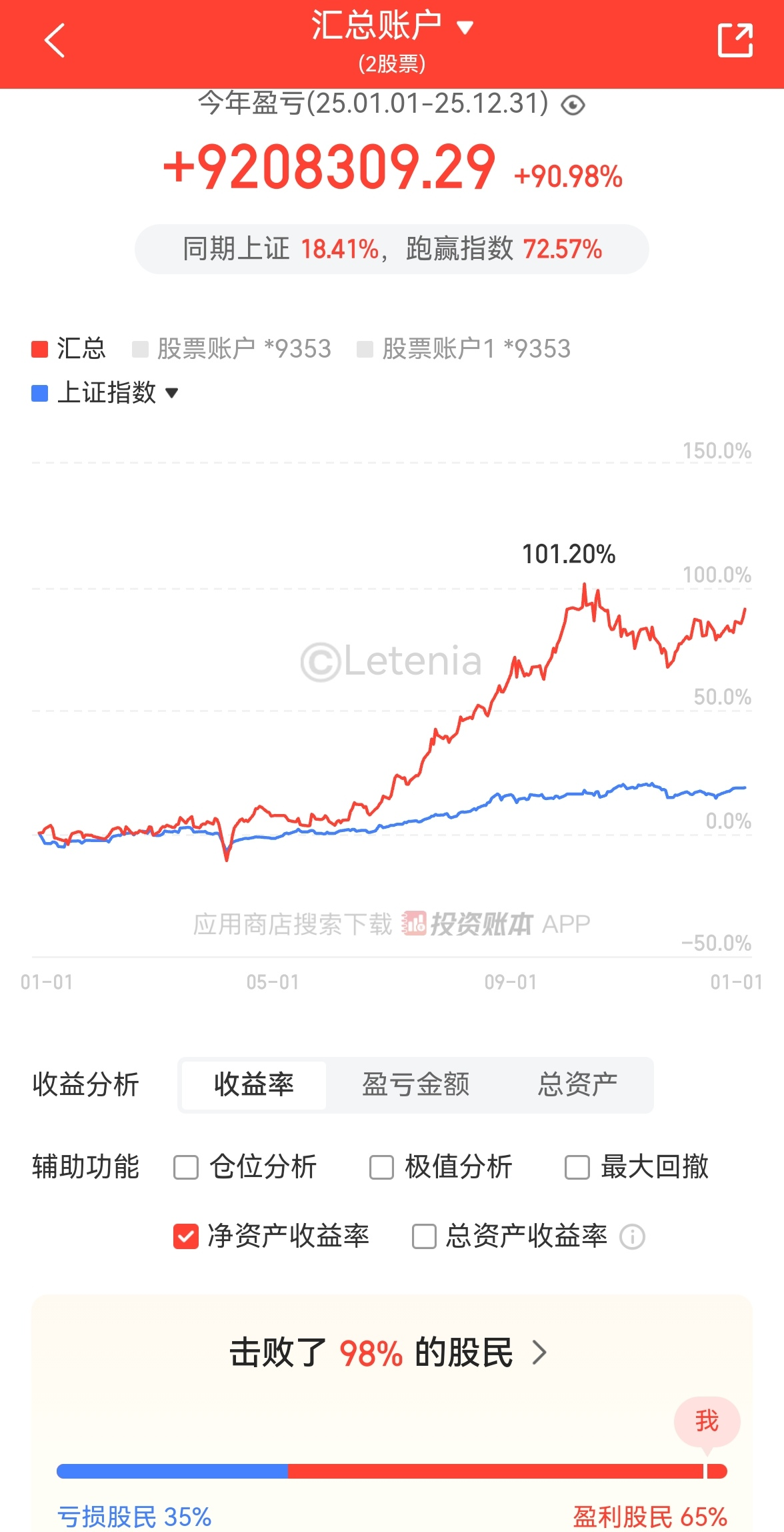 昨天上证突破了3800,晚上在等jackson hole时,把几个投资类的app都刷了一遍,发现确实牛市氛围渐浓。在打开同花顺投资账本时,我又看到了置顶的那个2025牛市收益报告,也不记得这玩意是什么时候出现的了,似乎已经很久了,这点看来同花顺似乎颇有先见之明。报告起点是去年924,不知道终点会算到哪天,算给哪个标志性的事件,只是我突然发现,我报告期的收益正好摸到了100%以上。