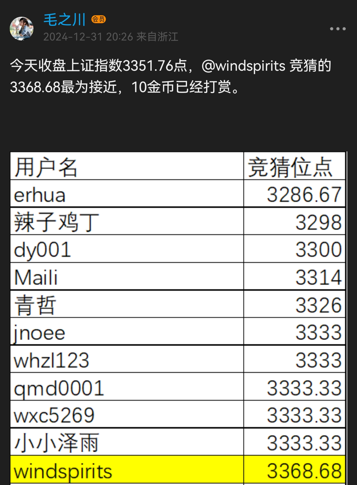 游戏规则:写下本轮牛市指数最高点,牛市结束后最接近者奖励500金币