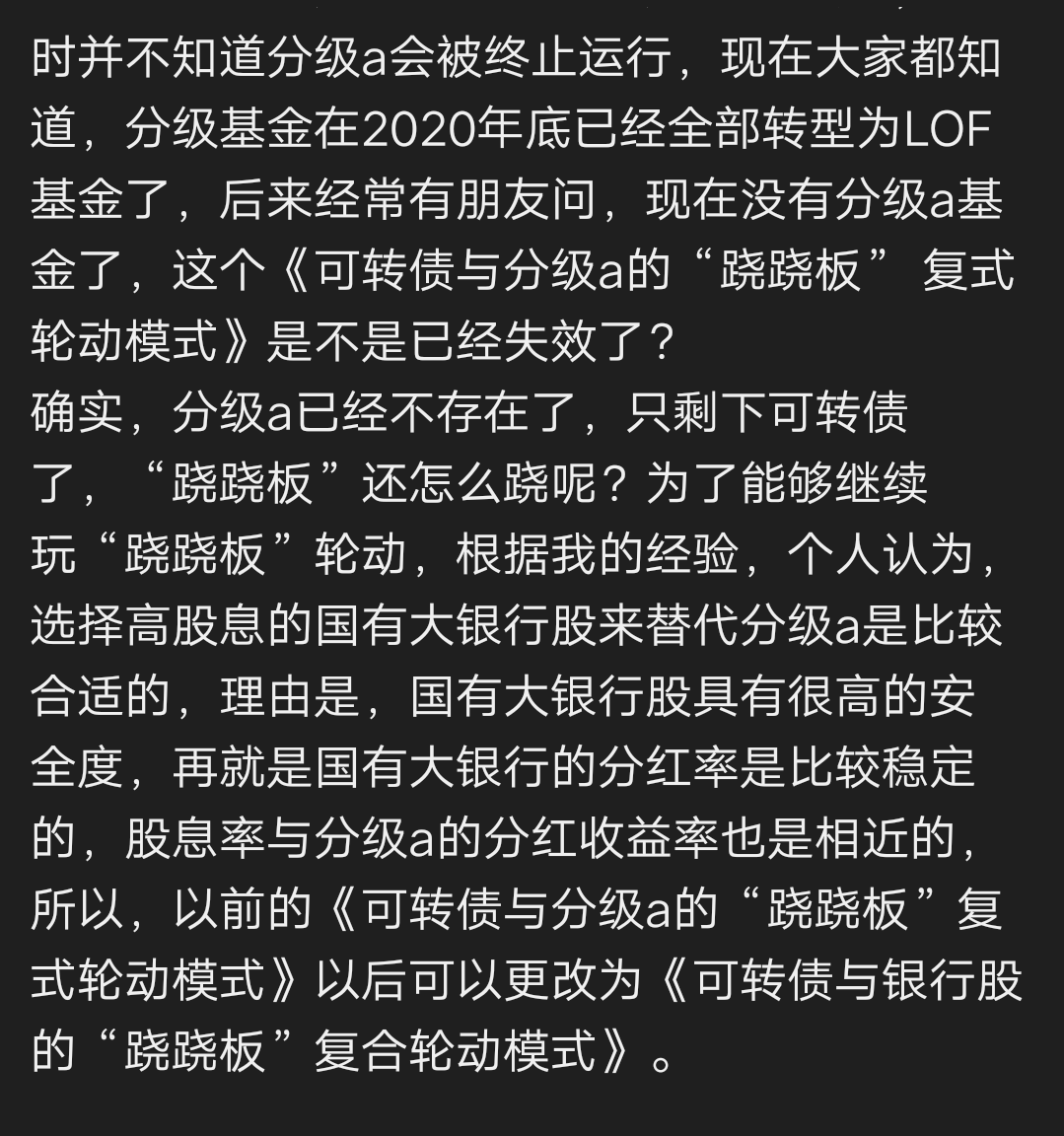 下面截图的里的文字源自2023年3月我在集思录发的帖子《可转债与银行股的跷跷板复合轮动模式》