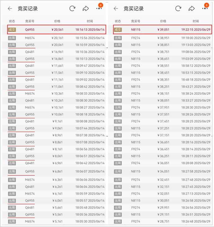 从竞拍明细看,Q6955以一种势在必得的姿态不停加价,甚至后边几条记录也能看出来,加价的方式都是跳空高举。如果是普通小散拍卖,应该会按照系统设置好的价格阶梯,一次只往上报一格,不会上来就扫卖5的成交。