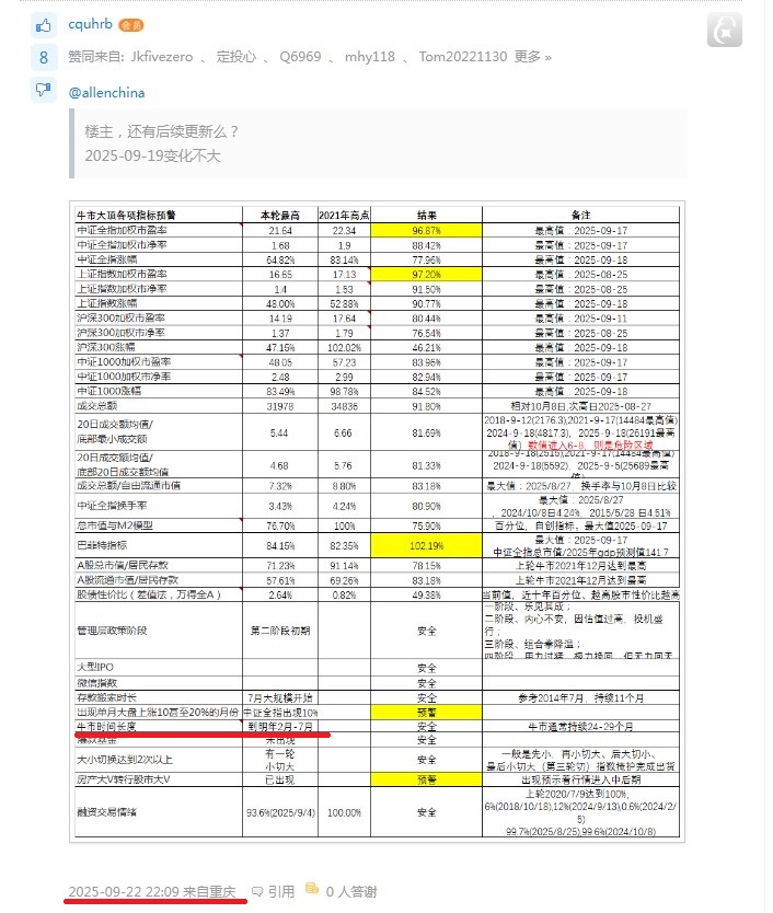 目前看有两项指标超出了95%,出现了预警。当然这仅是同上一轮牛市比较,等空了再补充2015年大牛市的数据!