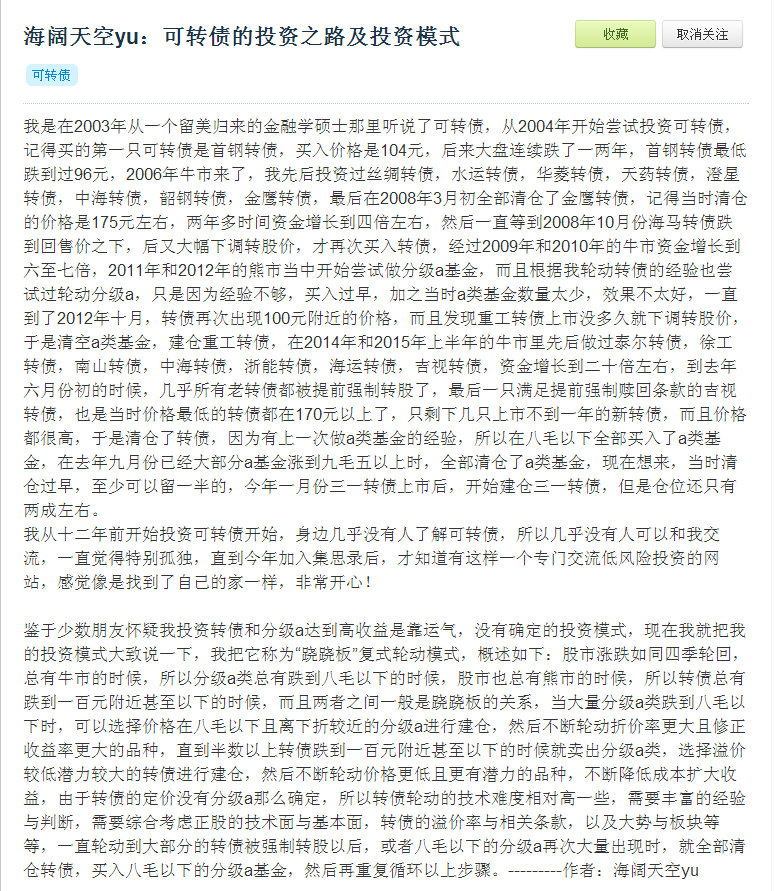 你可能加入集思录的时间比较晚,对我不太了解,下面是我2016年3月在集思录发的第一篇帖子,这个帖子应该也是集思录上最早明确提出可转债轮动的帖子,因为时间太早,现在集思录上已经查不到了。