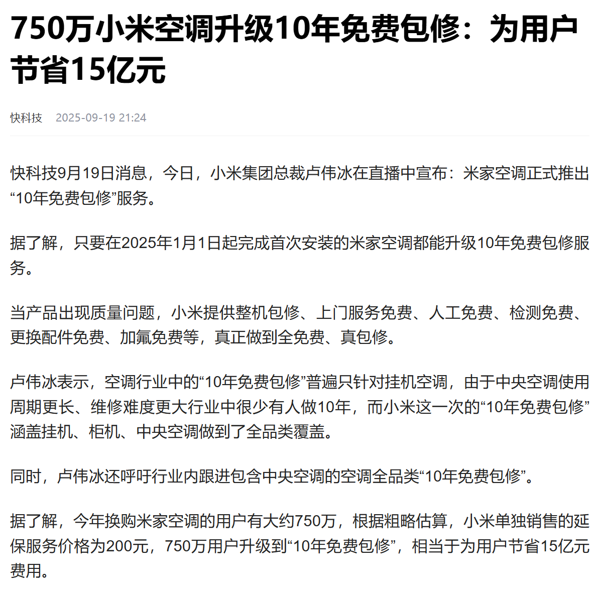 小米暴款的话,那应该买长虹华意这个股票,长虹给小米代工(应该不是独家,但是肯定有长虹)而且有一段时间账上现金大于市值。现在马上秋冬了,空调生意开始转淡,不少安装师傅可能短暂转行干滴滴和外卖。个人认为这个时候宣布十年保修空调利好政策有点像冬天甚至春节推销冰淇淋,属于舆论占领高度,为第二年开春储备客户