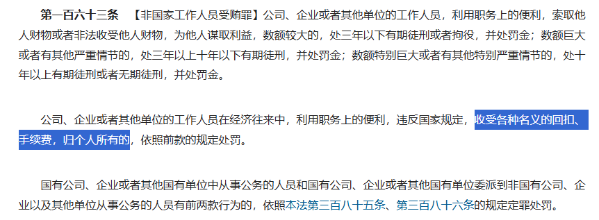 刑法领域要求企业职工收到的返佣要上缴企业,否则算非国家工作人员受贿。